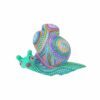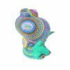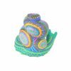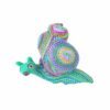 El alebrije tiene forma de caracol, ricamente decorado con múltiples colores vibrantes y patrones complejos, característicos del arte popular mexicano. La pintura detallada cubre toda la pieza, creando diseños únicos. Los colores incluyen tonos de azul, verde, morado, naranja y amarillo, lo que le da una apariencia muy vivaz y alegre.