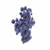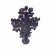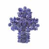 La cruz es de cerámica embellecida con una profusión de flores y follaje en distintos tonos de azul. La pieza es tridimensional y las flores y hojas parecen brotar de la superficie de la cruz, creando una textura rica y un efecto visual dinámico. La monocromía del azul destaca la delicadeza y detalle de cada elemento.