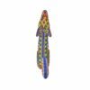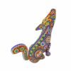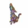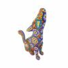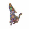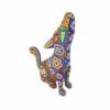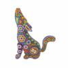 El lobo huichol, una obra de arte altamente decorativa y colorida. La pieza está meticulosamente cubierta con un mosaico de cuentas pequeñas formando patrones detallados y simétricos con una gama de colores vivos, como naranja, azul, amarillo y rojo. La postura del lobo es dinámica, con la cabeza alzada hacia arriba, como si estuviera aullando o atento a su entorno.