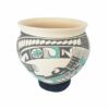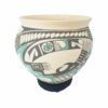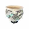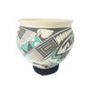 La vasija tiene un diseño pintado, predominantemente en tonos de negro y blanco con acentos en turquesa. Los motivos decorativos incluyen patrones geométricos y abstractos.