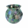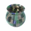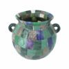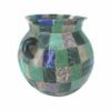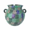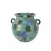 La vasija de ónix tiene un diseño de mosaico. Los tonos del ónix varían entre verdes, azules y algunos matices de color crema o marrón, dispuestos en un patrón de cuadrados que recuerdan a un tablero de ajedrez. La forma de la vasija es tradicional, con una boca ancha y dos asas. La vasija tiene una persona acostada boca abajo con los piez en el aire delineada en la superficie.